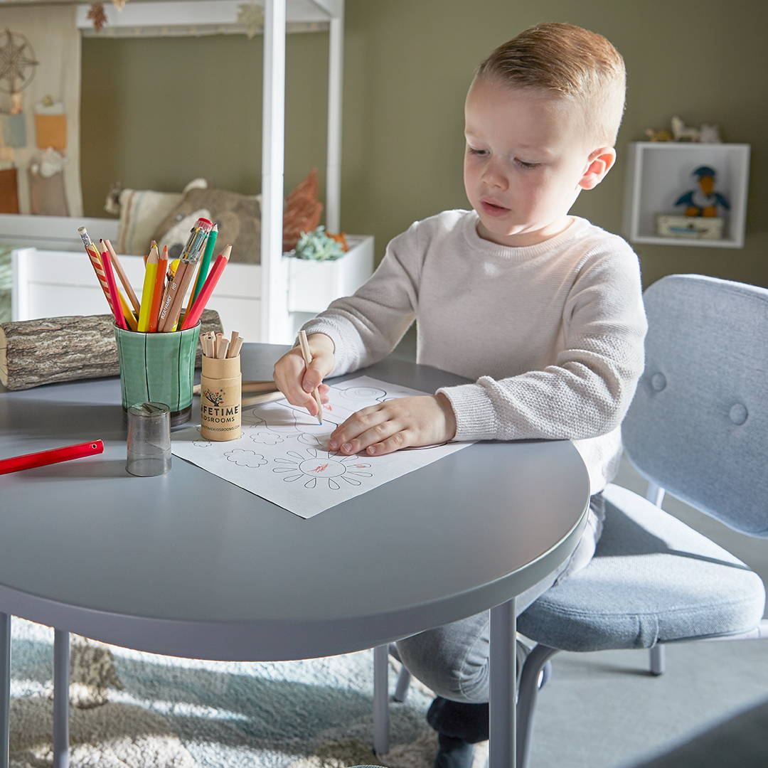 CHILL tvoří stoličky, židle, lavice a kulatý stůl. Celá kolekce je navržena tak, aby pozvala děti do útulného a pohodlného sezení, které inspiruje ke hře a odpočinku.